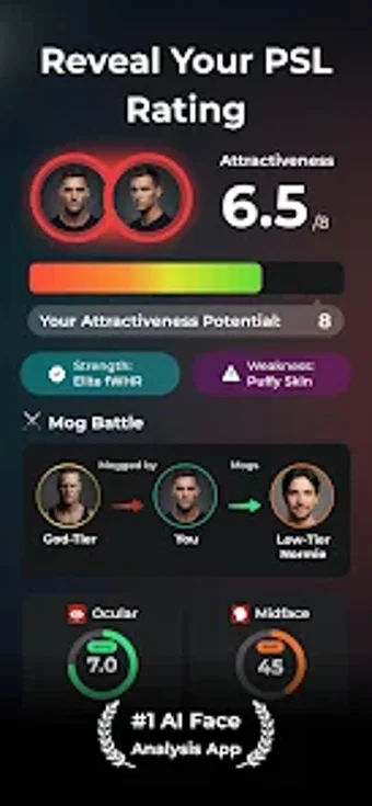 该应用还提供发型和颜色分析工具,允许用户在做出更改之前可视化不同的发型和颜色。凭借 GymMax 等功能进行身体评估和声音分析以增强自信,UMAX AI:Jawmax, Looksmax & PSL 采用全面的方法进行个人转变。隐私被优先考虑,因为图像被安全处理,确保用户可以专注于自我提升的旅程。